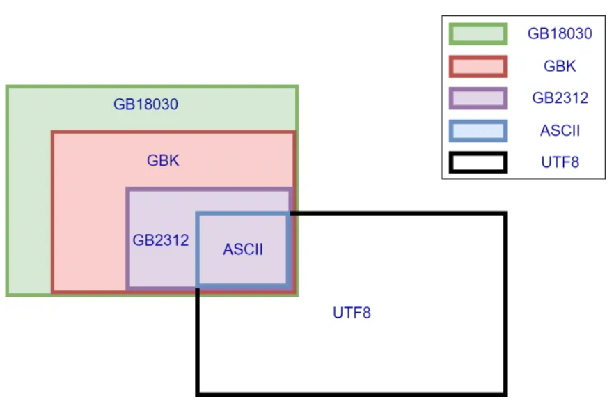 几种常见中文编码之间存的兼容性,如下图所示: