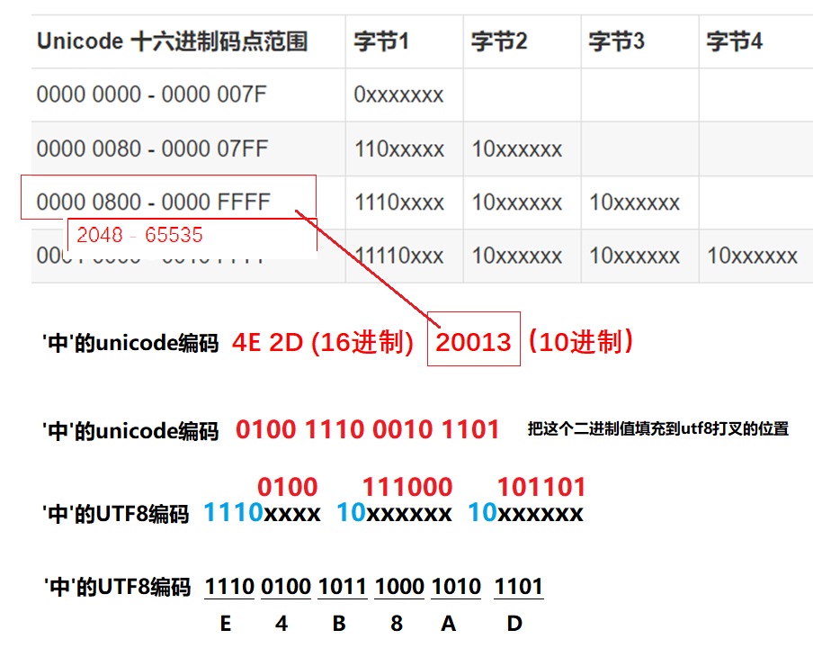 把汉字'中'的unicode编码 4E 2D ,转换为UTF8编码 E4 B8 AD,的过程如下图所示:
