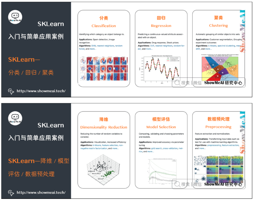 SKLearn对常用的机器学习方法进行了封装,例如,分类、回归、聚类、降维、模型评估、数据预处理等,我们只需调用对应的接口即可。