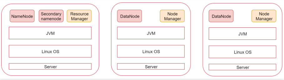 我们来看一下这张图,图里面表示是三个节点,左边这一个是主节点,右边的两个是从节点,hadoop集群是支持主从架构的。
