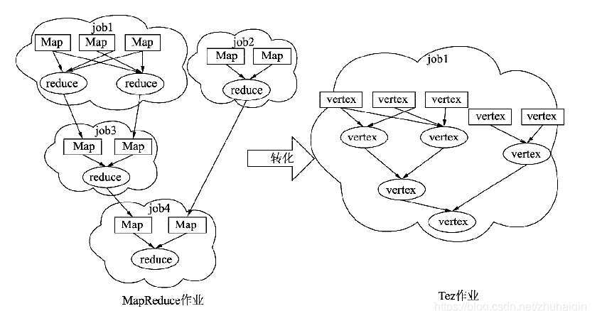 Tez绕过了MapReduce很多不必要的中间的数据存储和读取的过程,直接在一个作业中表达了MapReduce需要多个作业共同协作才能完成的事情。