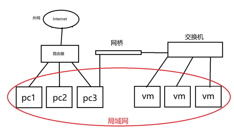 实现原理:pc3是我们的电脑,我们在电脑的VMware创建了虚拟机,首先pc3会在网卡上创建出一个虚拟网桥,为了能连接更多的vm虚拟机我们还需要创建一个虚拟交换机,此时我们连接的线路就可以理解为:路由器->vm虚拟机。