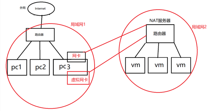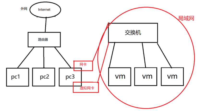 实现原理:pc3是我们的电脑,我们在电脑的VMware创建了虚拟机,首先pc3会在网卡上创建出一个虚拟出一个类似于交换机功能的服务器,此时通过这条线路不可以连接到外网(Internet),它的作用是类似交换机的作用,它还能分配ip地址等其他功能。同时我们还要再创建一个虚拟网卡,这样我们vm虚拟机就能和pc3主机进行相互访问了。