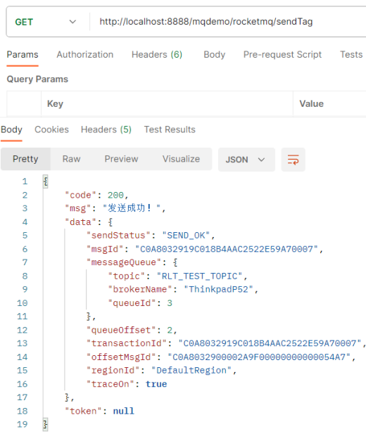 用postman调用测试: 1). http://localhost:8888/mqdemo/rocketmq/send