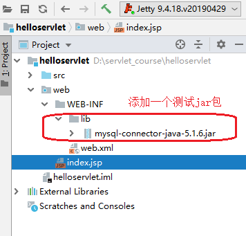 1).在项目的WEB-INF下新建lib目录。并添加一个测试jar包,如下: