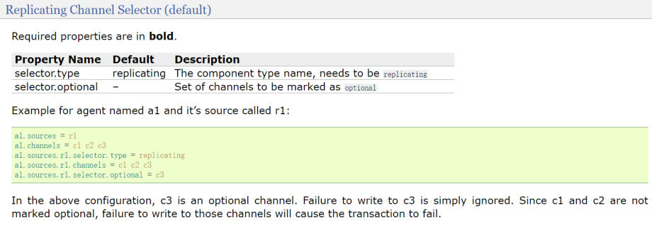 在这个例子的配置中,c3是可选channel。对c3的写入失败将被忽略。由于c1和c2未标记为可选,因此未能写入这些channel将导致事务失败,针对这个配置,通俗一点来说就是,source的数据会发往c1、c2、c3这三个channle中,可以保证c1、c2一定能接收到所有数据,但是c3就无法保证了。这个selector.optional参数是一个可选项,可以不用配置就行。