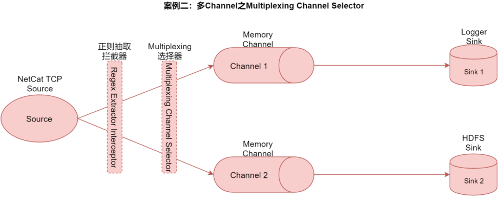 在这个案例中我们使用Multiplexing选择器,将source采集到的数据按照一定规则发送给两个channle,最终再把不同channel中的数据存储到不同介质中。