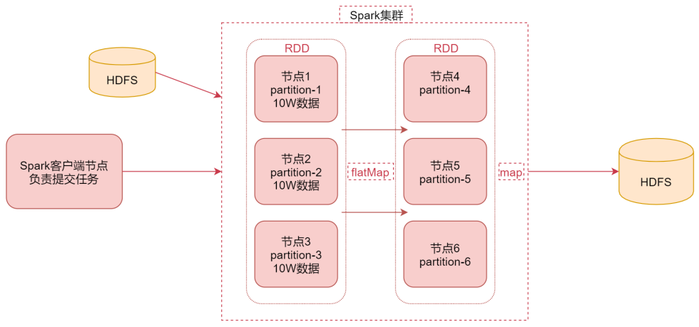 首先看中间是一个Spark集群,可以理解为是Spark的standalone集群,集群中有6个节点。左边是Spark的客户端节点,这个节点主要负责向Spark集群提交任务,假设在这里我们向Spark集群提交了一个任务。那这个Spark任务肯定会有一个数据源,数据源在这我们使用HDFS,就是让Spark计算HDFS中的数据。当Spark任务把HDFS中的数据读取出来之后,它会把HDFS中的数据转化为RDD,RDD其实是一个弹性分布式数据集,它其实是一个逻辑概念,在这你先把它理解为是一个数据集合就可以了,后面我们会详细分析这个RDD。