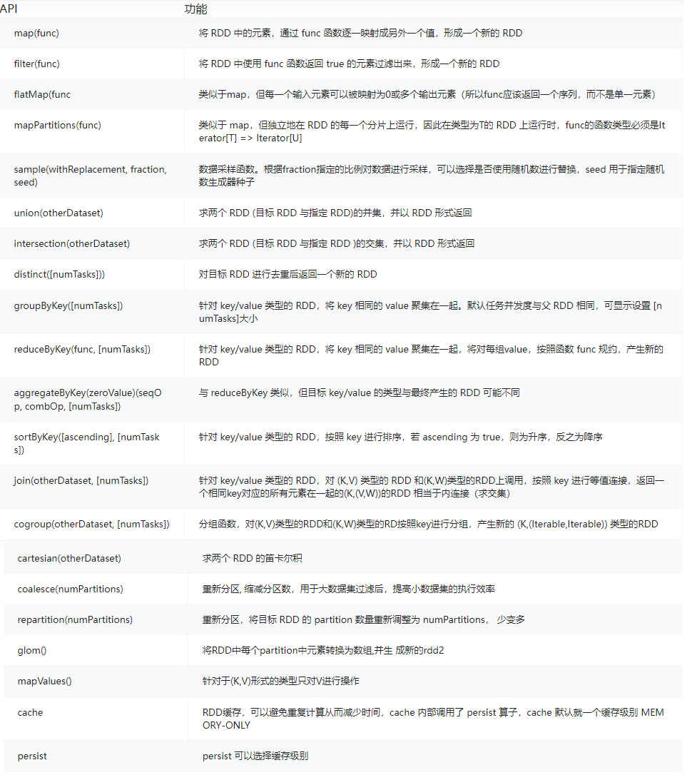 常见的transformation算子见下表。
