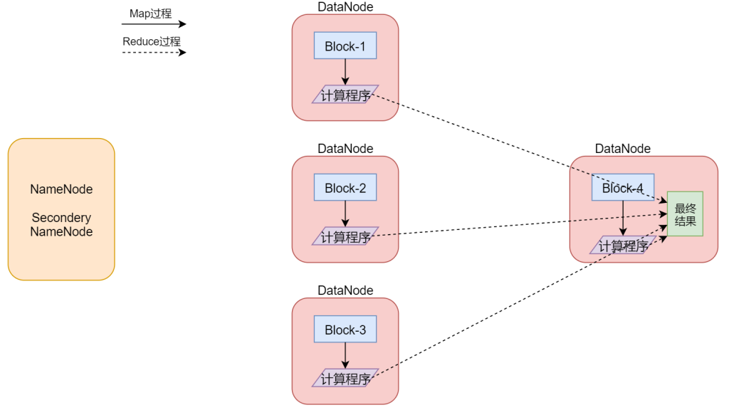 假设我们有一个512M的文件,这个文件会产生4个block块,假设这4个block块正好分别存储到了集群的4个节点上,我们的计算程序会被分发到每一个数据所在的节点,然后开始执行计算,在map阶段,针对每一个block块对应的数据都会产生一个map任务(这个map任务其实就是执行这个计算程序的),在这里也就意味着会产生4个map任务并行执行,4个map阶段都执行完毕以后,会执行reduce阶段,在reduce阶段中会对这4个map任务的输出数据进行汇总统计,得到最终的结果。