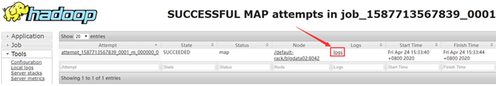 此时,点击对应map和reduce后面的链接就可以点进去查看日志信息了,点击map后面的数字1,可以进入如下界面.