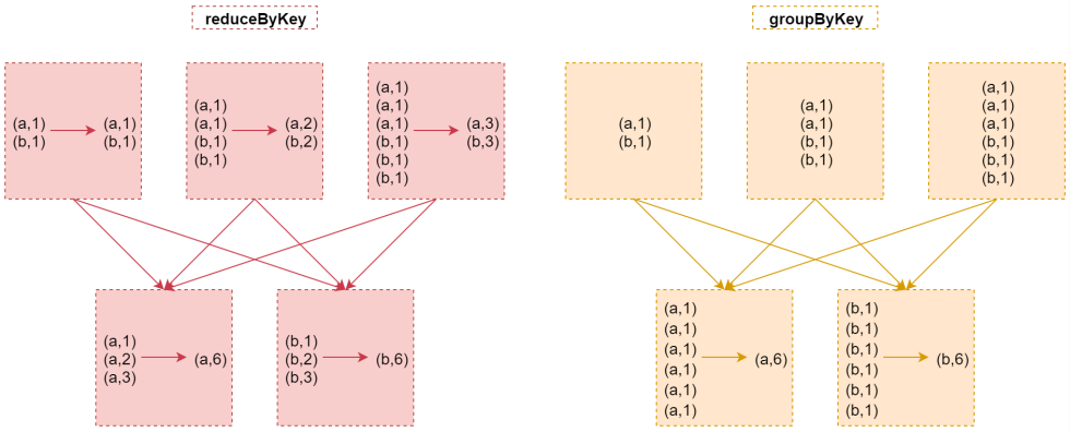 从上图我们可以看出来reduceByKey在shuffle之前会先对数据进行局部聚合,而groupByKey不会,所以在实现分组聚合的需求中,reduceByKey性能略胜一筹。