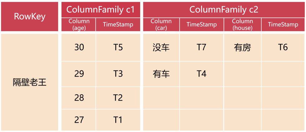 这个图的意思表示在HBase中有一张表,表里面有2个列族,c1和c2,目前这个表里面有1条数据,这条数据的RowKey就是:隔壁老王。其中列族c1里面只有1列,是age,列族c2里面有2列,car和house针对列族c1中的age列的值而言,有4个历史版本:T1,T2,T3,T5。
