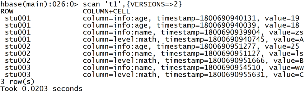图中执行scan 't1',{VERSION=>2}(全表扫描) 命令之后,最终返回了3条数据,Rowkey是:stu001,stu002,stu003。