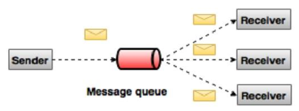 点对点消息队列系统如下图所示,消息被保存在一个队列中。 一个或多个消费者可以消费队列中的消息,但是特定的消息只能由最多一个消费者消费。 一旦消费者在队列中读取消息,消息就从该队列中消失。典型例子是一个订单处理系统,其中每个订单将由一个订单处理器处理,但是多订单处理器也可以同时工作。