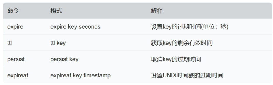 小结: - 当key永久存在的时候,执行ttl返回的是-1。 - 当key被设置了过期时间之后,执行ttl返回的就是这个key剩余的有效时间。 - 当key已经被删除了,不存在的时候,执行ttl返回的是-2。