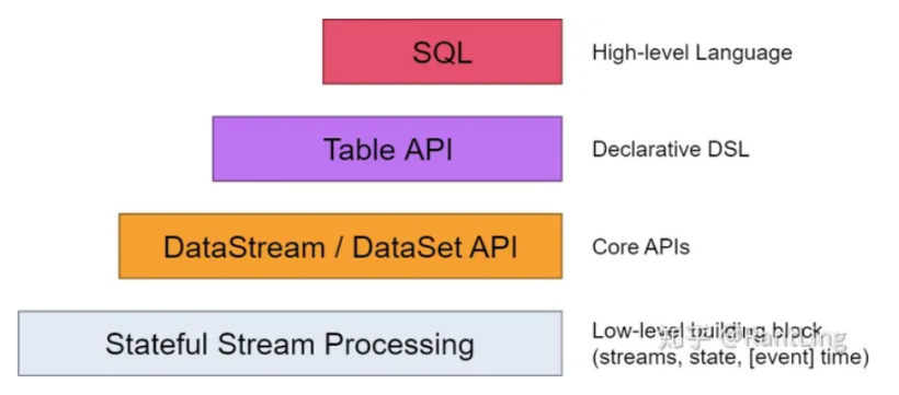 在Flink,编程模型的抽象层级主要分为以下4种,越往下抽象度越低,编程越复杂,灵活度越高。