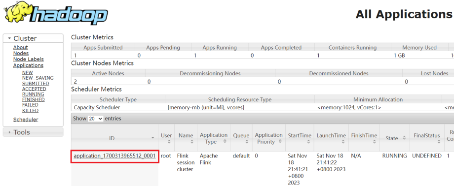 此时到YARN的web界面中确实可以看到这个flink集群。