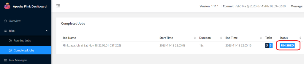 任务提交上去执行完成之后,再来看flink的web界面,发现这里面有一个已经执行结束的任务了。
