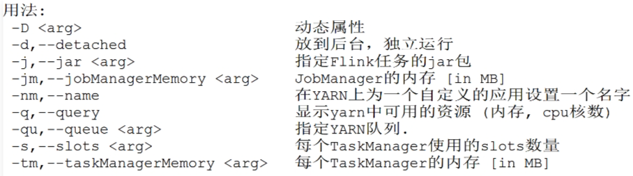 针对yarn-session命令,它后面还支持一些其它参数,可以在后面传一个-help参数,在这我对一些常见的命令进行了整理,添加了中文注释。如下表所示。