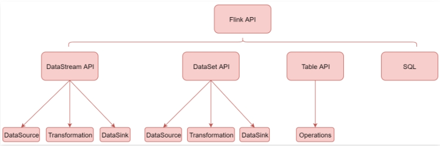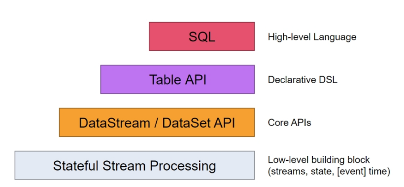 - 低级API(Stateful Stream Processing):提供了对时间和状态的细粒度控制,简洁性和易用性较差,主要应用在一些复杂事件处理逻辑上。