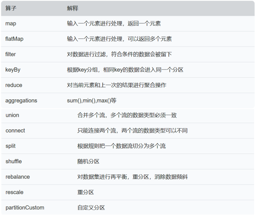 transformation是Flink程序的计算算子,负责对数据进行处理,Flink提供了大量的算子,其实Flink中的大部分算子的使用和spark中算子的使用是一样的,下面常用算子: