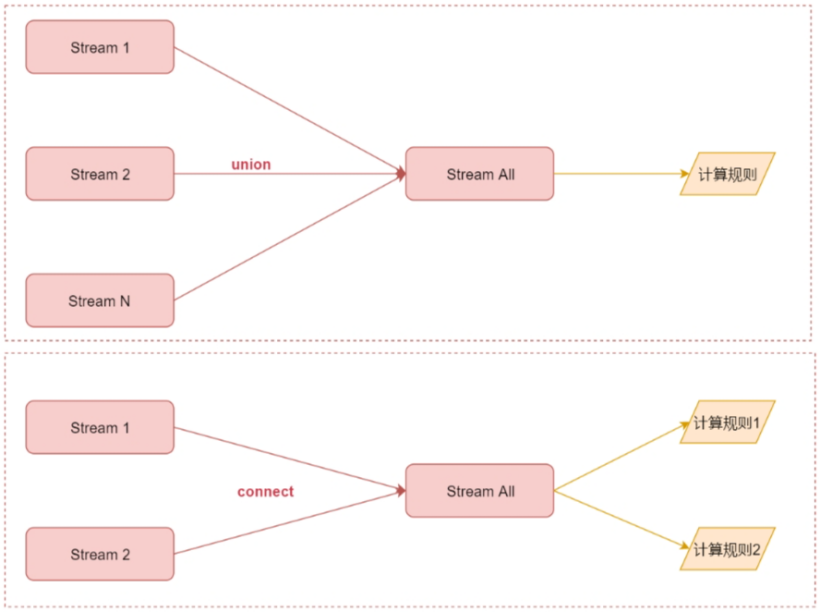 union可以连接多个流,最后汇总成一个流,流里面的数据使用相同的计算规则 connect值可以连接2个流,最后汇总成一个流,但是流里面的两份数据相互还是独立的,每一份数据使用一个计算规则。