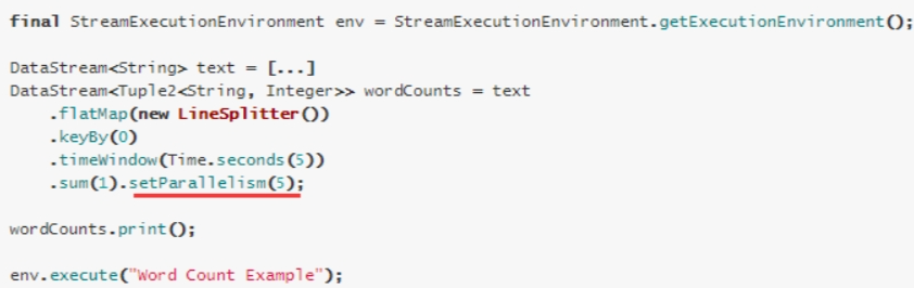 算子、数据源和目的地的并行度可以通过调用 setParallelism()方法来指定。