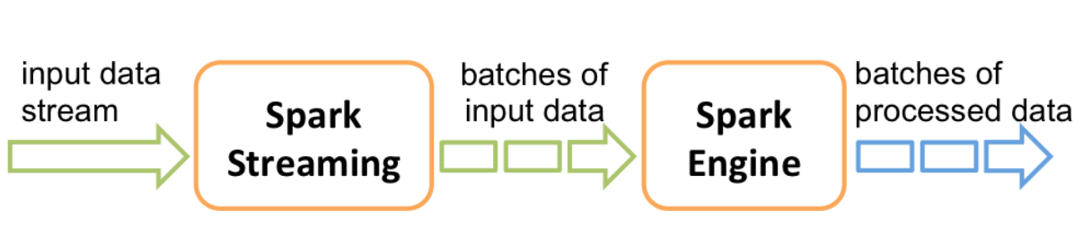 Spark Streaming的工作原理是这样的: 接收实时输入数据流,然后将数据拆分成多个batch,比如每收集1秒的数据封装为一个batch,然后将每个batch交给Spark计算引擎进行处理,最后会生产出一个结果数据流,其中的数据,也是由一个一个的batch所组成的。