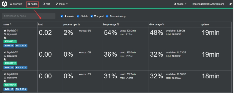 注意:集群有三种状态,green、yellow、red。