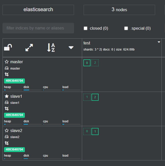 其中实线的框表示是主分片,虚线框是副本分片。 索引分片编号是从0开始的,并且索引分片在物理层面是存在的,可以到集群中查看一下,从界面中也看到test索引库的1号和2号分片是在slave1和slave2节点上的。