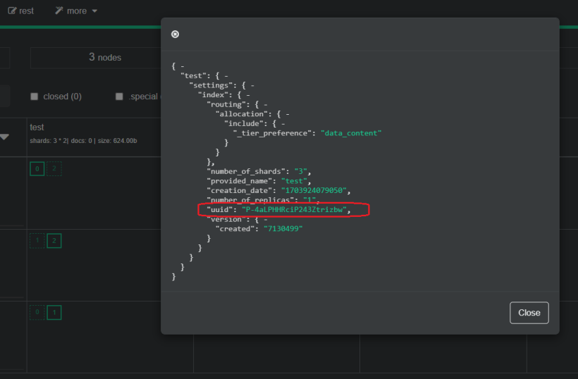 选择test的show settings选项,里面可以查看这里面的P-4aLPHHRciP243Ztrizbw表示的是索引库的UUID。我们也可以到master节点中看一下,ES中的所有数据都在ES的数据存储目录中,默认是在ES_HOME下的data目录里面。