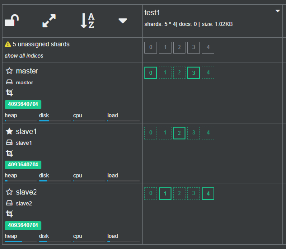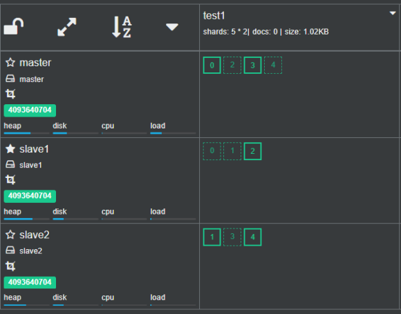 我们也可以在cerebro观察新创建的test1索引的分片和副本状态。
