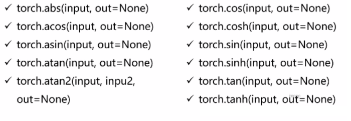 PyTorch提供了标准的三角函数:sin()、cos()、tan()。 说明:如果把数组A作为x轴数据,把三角函数的运算结果B作为y轴数据,并送给画图工具,就可以得到三角函数的图像。