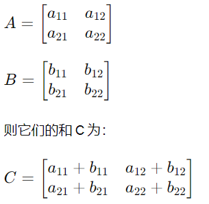 矩阵的加法是指对应位置上的元素相加的运算。如果有两个矩阵 A 和 B,它们的维度相同(即行数和列数相等),则可以将它们相加得到另一个矩阵 C。对于 C 的每个元素 C(i,j),都是对应位置上 A(i,j) 和 B(i,j) 元素的和。