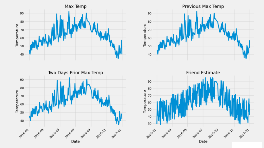 ax4.set_xlabel('Date'); ax4.set_ylabel('Temperature'); ax4.set_title('Friend Estimate')