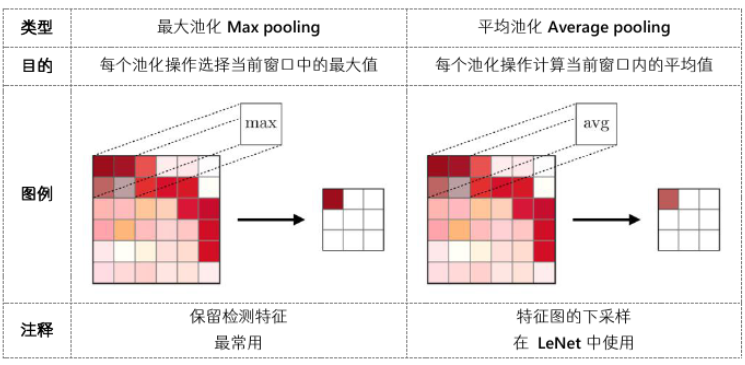 最大池化(Max pooling)和平均池化(Average pooling)是两种特殊的池化方式,分别取邻域内的最大值和平均值作为单元输出。