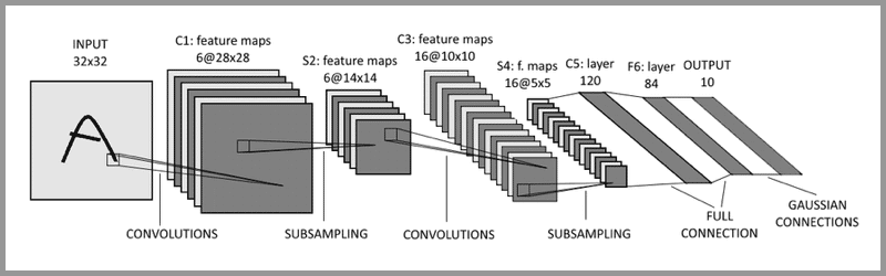 典型的 CNN 并非只是上面提到的3层结构,而是多层结构。例如,LeNet-5被誉为是卷积神经网络的“Hello Word”。LeNet-5是图灵奖获得者Yann LeCun(杨立昆)在1998年提出的CNN算法,用来解决手写识别的问题。