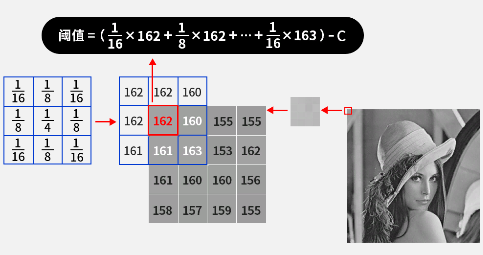 优点: - 适应复杂背景:能够根据图像局部特征动态调整阈值,适应背景复杂或光照不均匀的情况。 - 局部适应性:每个像素的阈值是根据其邻域的平均值计算的,因此可以更准确地分割前景和背景。