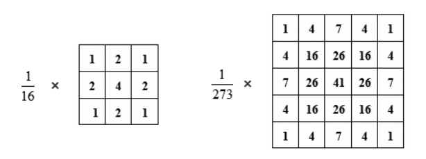 上图所示是常用的两种高斯模板, 左侧是常用的3 * 3的高斯模板,右侧是常用的5*5高斯模板。高斯模板中的参数是通过高斯函数计算出来的,这里不详细展开讲解。