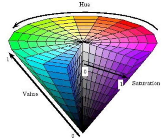 HSV(Hue, Saturation, Value)是根据颜色的直观特性由A. R. Smith在1978年创建的一种颜色空间, 也称六角锥体模型(Hexcone Model)(参考百度)。在HSV模型中,颜色是由色相(Hue),饱和度(Saturation),明度(Value)共同组成。