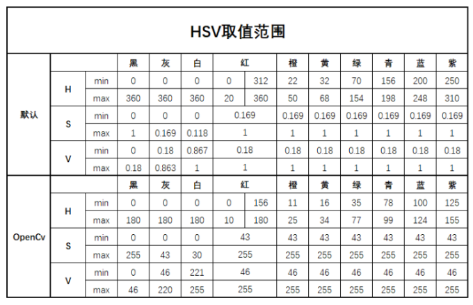 下面是HSV通道对应颜色数值范围参考表: