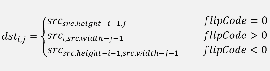 图像翻转是将图像在水平或垂直方向上进行反转。OpenCV中,图像翻转可以使用cv::flip()函数来实现。该函数可以将图像在水平或垂直方向上进行翻转,或者同时进行水平和垂直翻转。镜像翻转的数学公式如下: