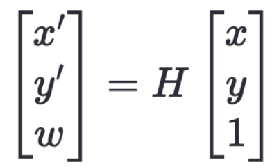 透视变换的核心是一个3x3的变换矩阵 H,该矩阵定义了输入图像坐标系与输出图像坐标系之间的映射关系。 假设输入图像上的点为 (x,y),经过透视变换后得到输出图像上的点 (x′,y′),则有: