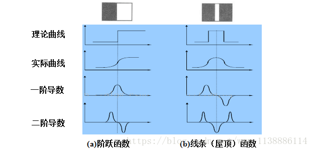 边缘类型:简单分为4种类型,阶跃型、屋脊型、斜坡型、脉冲型,其中阶跃型和斜坡型是类似的,只是变化的快慢不同。下图是阶跃型和屋脊型示意图。