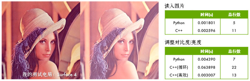 比如我分别用 Python 和 C++实现读入图片和调整图片的亮度对比度,结果如下: