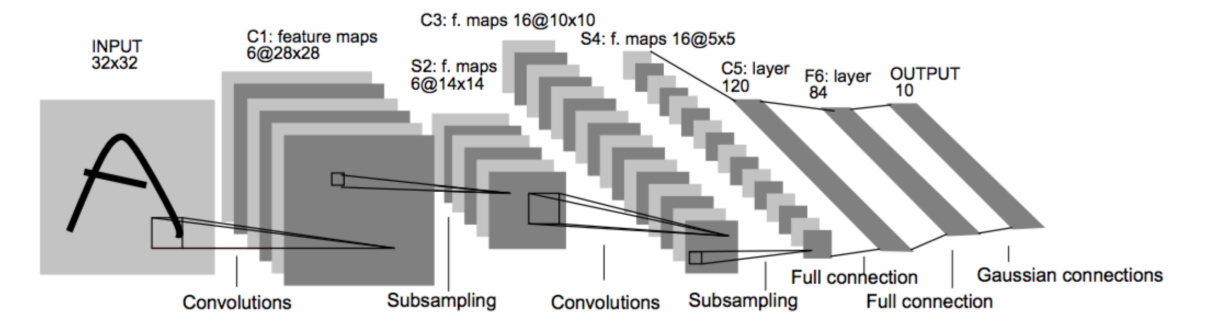 LeNet-5模型是由杨立昆(Yann LeCun)教授于1998年在论文Gradient-Based Learning Applied to Document Recognition中提出的,是一种用于手写体字符识别的非常高效的卷积神经网络,其实现过程如下图所示。