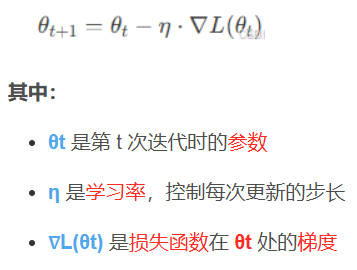 计算梯度: - 梯度是损失函数对参数 θ 的导数,表示损失函数在参数空间中的变化方向。 - 梯度下降通过沿着梯度的反方向更新参数,以最小化损失函数。