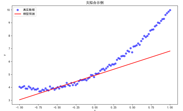 在上述代码中,我们使用了一个简单的线性模型去拟合一个二次函数关系的数据。由于模型的复杂度不足,它无法很好地学习到数据中的非线性关系,导致欠拟合。从可视化结果中可以看到,模型的预测线(红色)与真实数据点(蓝色)之间的差距较大,说明模型未能很好地拟合数据。