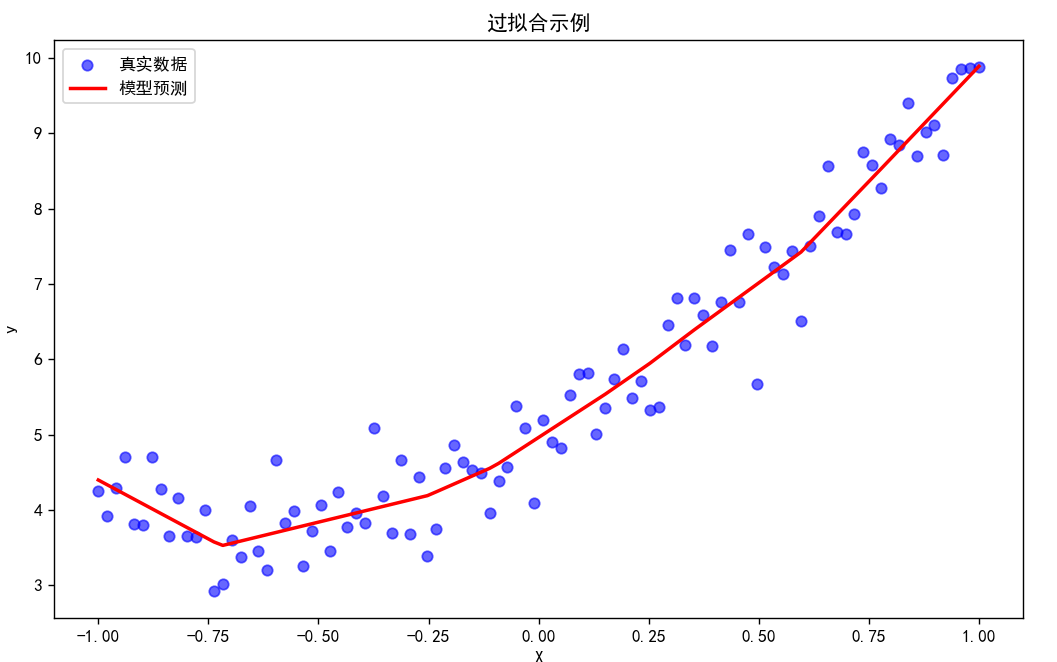 由于模型过于复杂,红色线条会显得过于波动,试图拟合每一个训练数据点,这就是过拟合的典型表现。